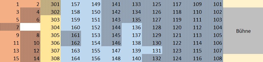 Ein Tisch der Kategorie 1 beinhaltet den Eintritt sowie Sitzplätze für 10 Personen. Die Tischnummern der Kategorie 1 sind die Tische 101-148.